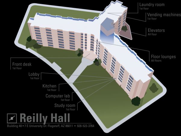 Reilly Hall is a coed, traditional-style community for primarily first-years and sophomores. At seven stories tall, it offers incredible views of the San Francisco Peaks. Inside, you'll find a computer lab, laundry facilities, a small gym, and a community kitchen—plus floor lounges perfect for studying. With the intramural fields right next door, it's easy to stay active and make the most of campus life.