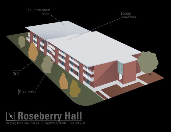 Roseberry Hall is a studio apartment-style Campus Living Community located in NAU’s North District, housing primarily first-years and sophomores. Each unit is shared by four students and includes a kitchen and bathroom, with shared lounge areas for studying and connecting with friends.